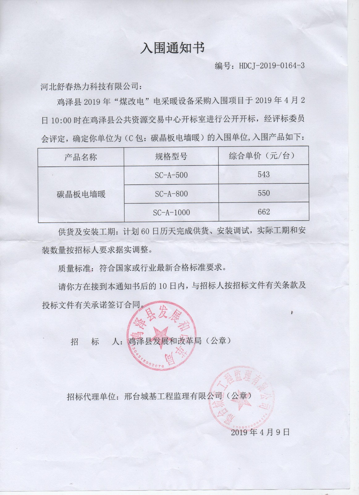 “煤改電”舒春在行動(dòng) 2019年4月9日,河北舒春熱力科技有限公司收到了來自雞澤縣發(fā)展和改革局的雞澤縣2019年“煤改電”電采暖設(shè)備采購入圍 項(xiàng)目C包:碳晶板電墻暖入圍通知書。 并于2019年4月18日正式簽訂采購安裝合同。